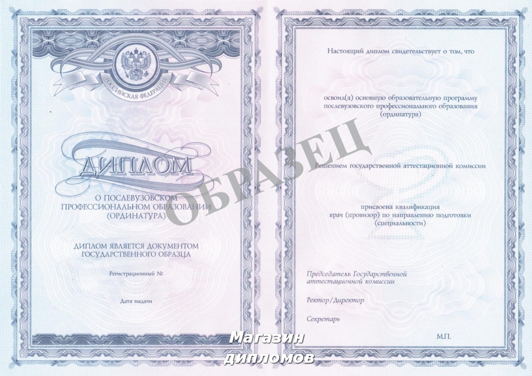 Удостоверение ординатуры Российской Федерации (Гознак, МТГ, Москва 2005 год.), выдавался с 2005 года.